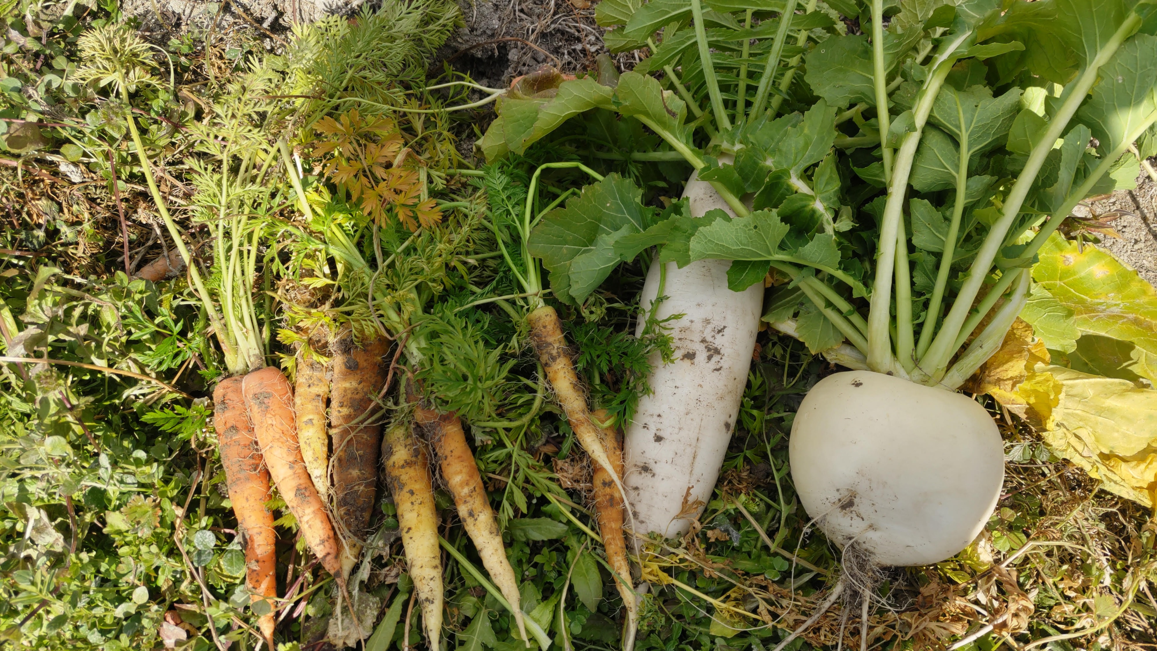 感性派の僕は肥料も農薬も使わず育った野菜の味がとにかく気になり、その場で収穫したばかりのニンジン、ダイコンを生でかぶりつきました(もちろん許可は得て試食してます!)