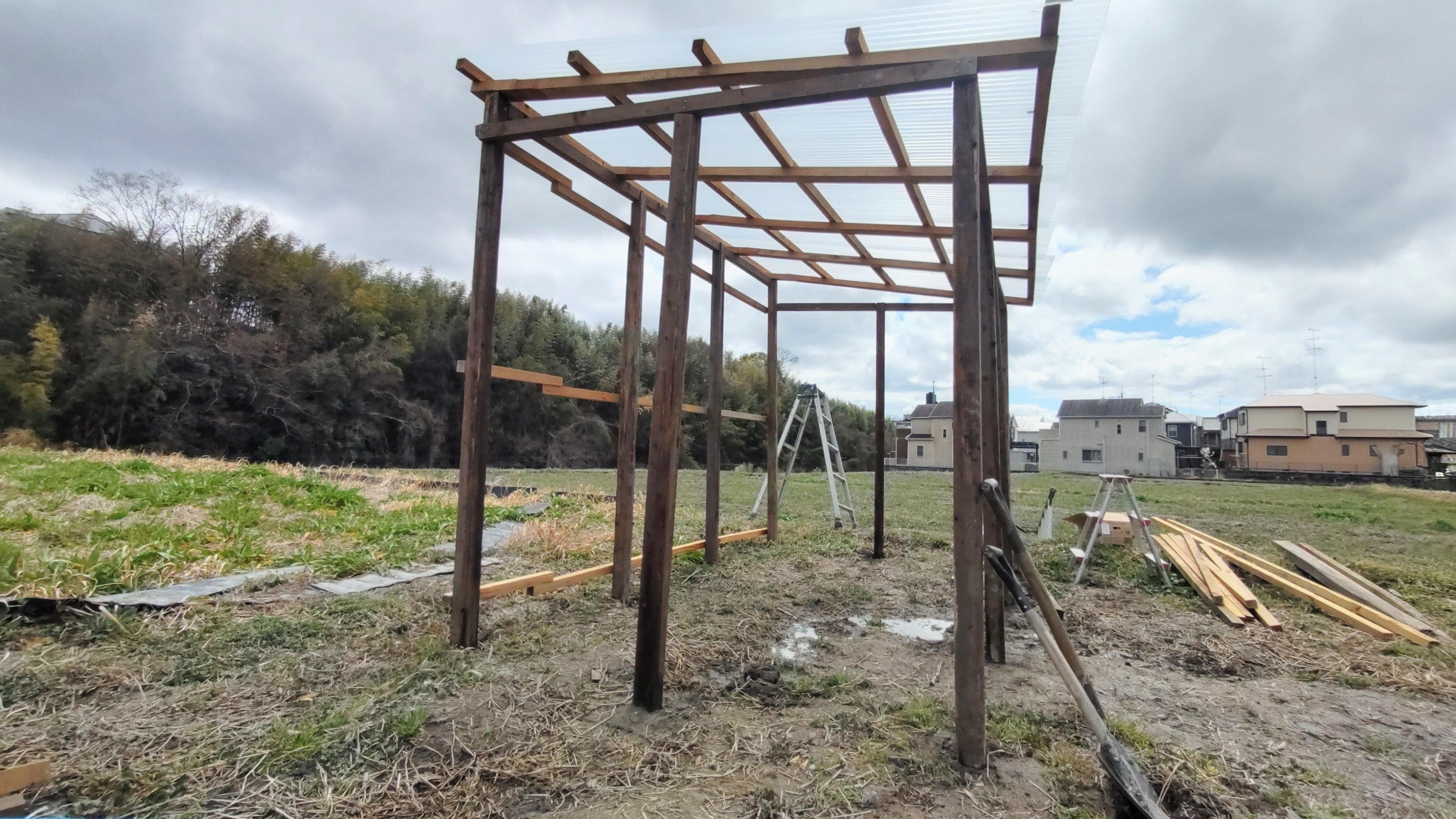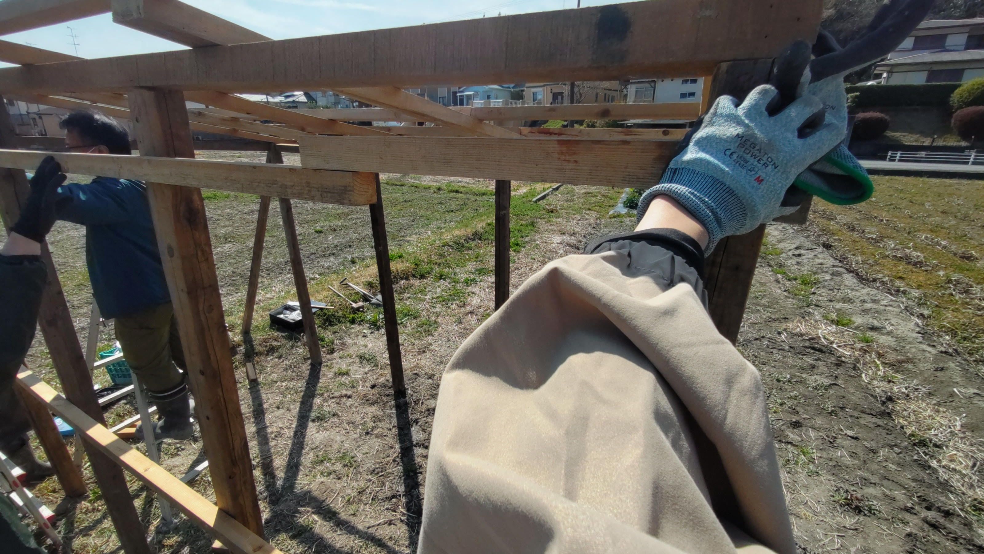 職員さん指導の下、小屋を作成中!